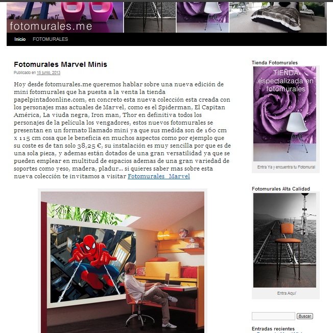 3 05 2013Desde fotomurales decorativos, hoy queremos hablaros sobre los murales panorámicos de Marvel y sus grande ventajas. Esta nueva colección llega de la mando de Fotomurales DC y se presenta como una genial ideal para decorar las habitaciones en concreto la de los niños ya que sus diseños son de los superheroes más famosos como Spiderman, Iron Man, Hulk, Thor, etc. Su formato de presentación es en una sola tira de 90 cm de alto x 202 de ancho, siendo de esa forma un fotomural de fácil instalación y de bajo coste, de esa forma con una mínima inversión puedes dar un cambio de look radical a la habitación de tus hijos, si quieres más información sobre este tipo de productos te recomendamos visitar Fotomurales Panorámicos Marvel